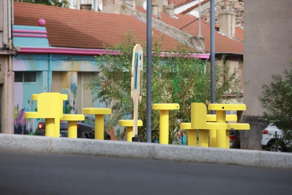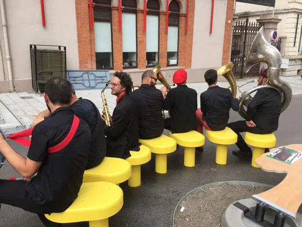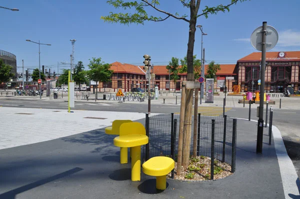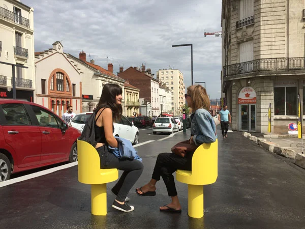 "The @ (Arobase) project consists of addressing a use or uses in a location to make it a nicer place. The furniture's colour and modularity encourage a playful and happy attitude in the public space."