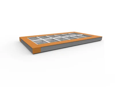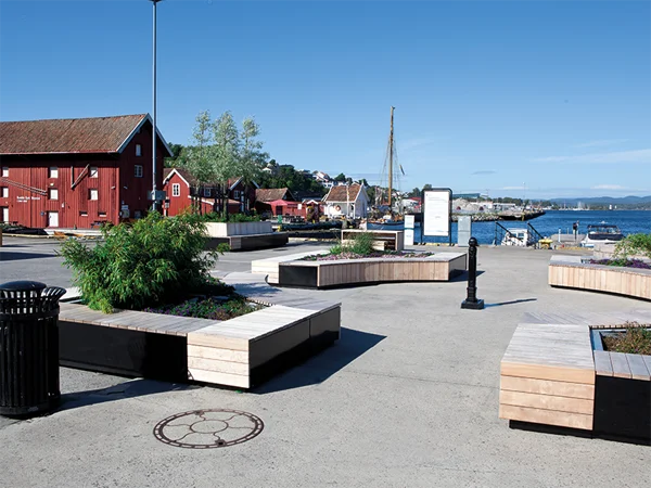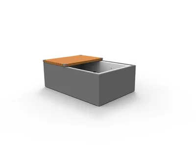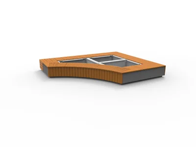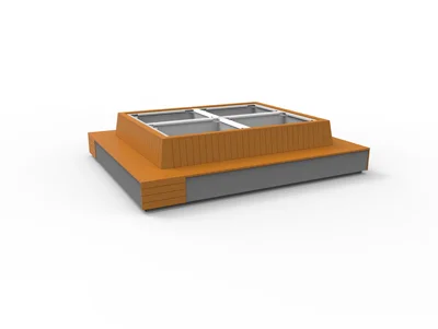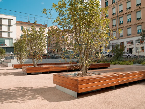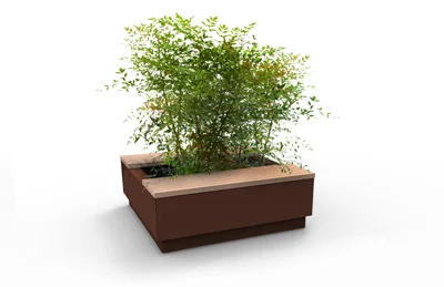 This furniture can be customised by mixing colours and vegetation. These gardens can be combined to create a customised layout. The seating is a ribbon of wood enveloping the raised base. The area that can be cultivated is made of planting tubs.