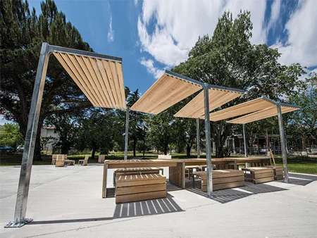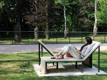 Si les matériaux (frêne/ bois exotique et acier galvanisé) rendent hommage à ce classique des campagnes et des espaces verts, ici les lignes s’étirent et dessinent une continuité visuelle qui s’accentue avec la multiplication des mobiliers. Dans une logique d’éco-conception, le design limite la consommation de matière par des formes simples et optimise les transports en imbriquant les assises à l’intérieur de la table