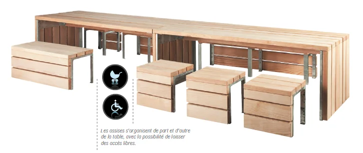 La Table de la rue s'allonge à l'infini grâce à son système modulaire : un module initial de 2 mètres de long, à compléter par des rallonges de 2 mètres, sans limite. Les assises se disposent librement autour et favorisent l'accessibilité.